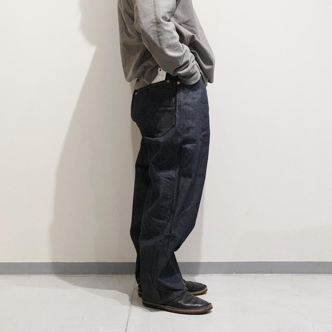 深めの股上、ボリュームのあるフィット、そしてSKEWedの象徴である右綾方向へのネジレが特徴です。